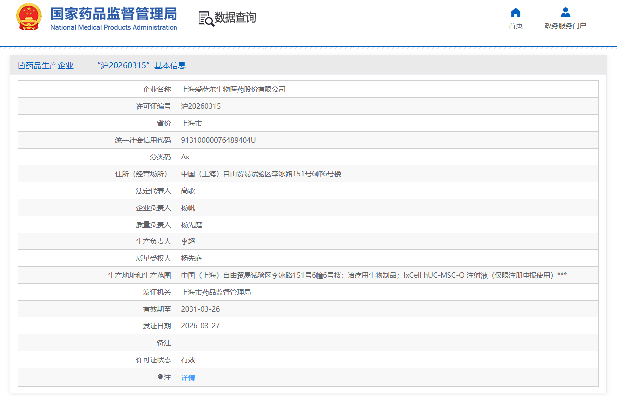 2026年4月6日,上海市药监局正式核发今年全国首张干细胞《药品生产许可证》,上海爱萨尔生物医药股份有限公司成为新年首位获证企业,许可证编号为沪20260315。许可信息显示,其生产范围包括治疗用生物制品:IxCell hUC-MSC-O注射液(仅限注册申报使用)。
