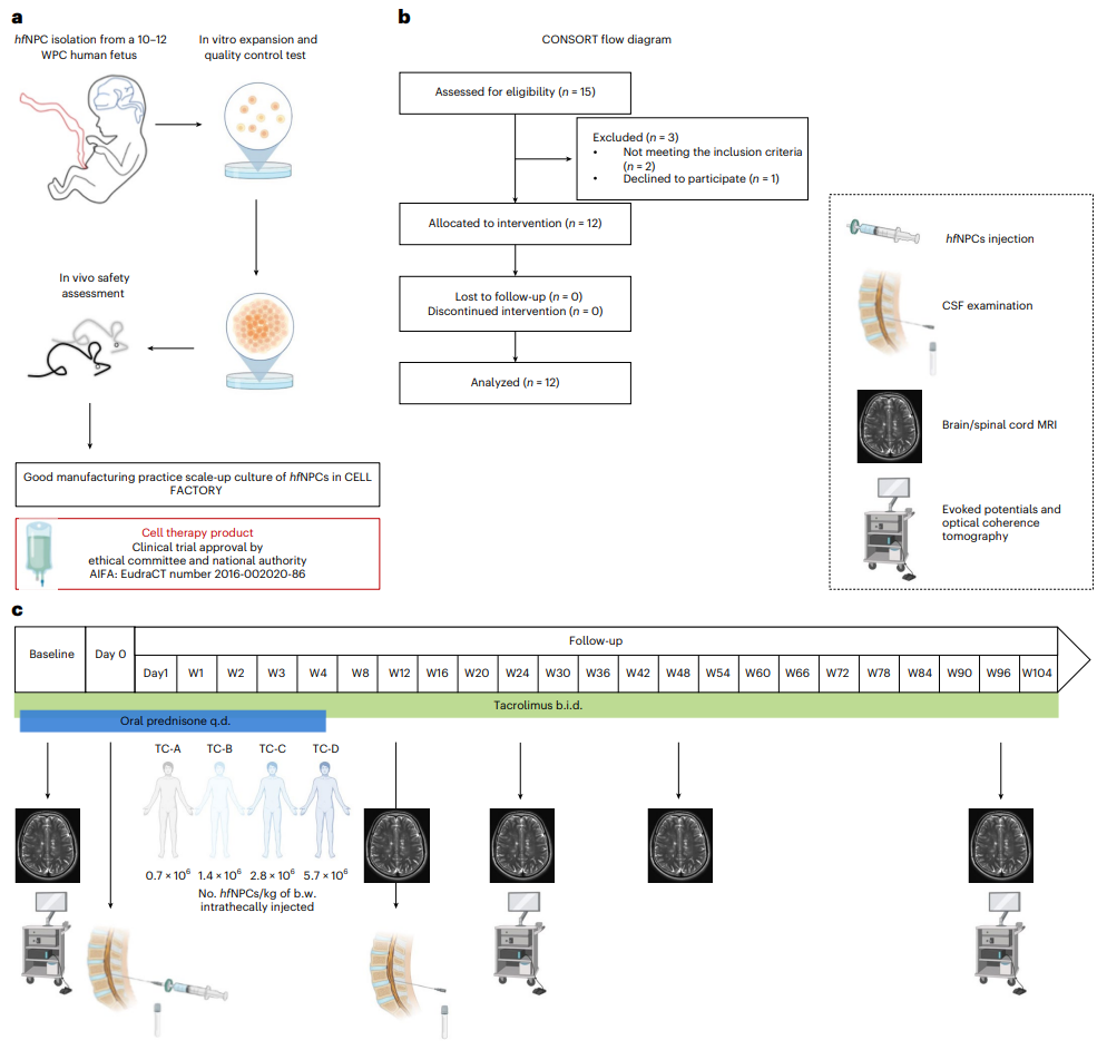 2023年1月9日,意大利IRCCS San Raffaele科学研究所等机构的研究人员在国际顶尖医学期刊Nature Medicine 上发表了题为:Neural stem cell transplantation in patients with progressive multiple sclerosis: an open-label, phase 1 study 的研究论文。