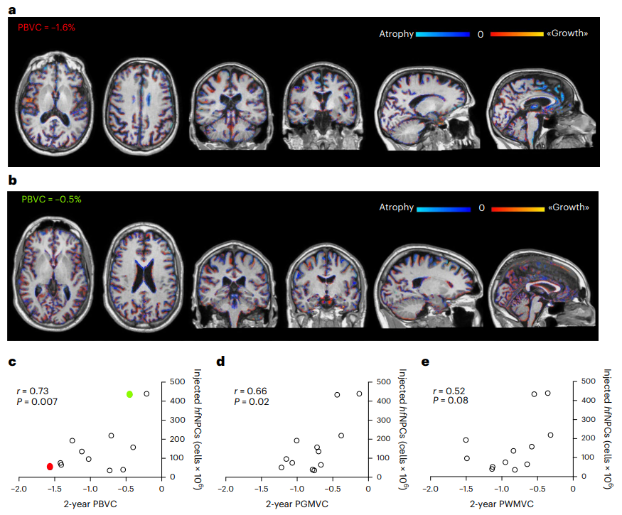 三个月后,每位患者又进行了一次腰椎穿刺,研究团队发现,他们的脊髓液中的神经保护和抗炎分子都有所增加。每位患者在注射胚胎干细胞治疗两年后还接受了核磁共振扫描,那些注射最多胚胎干细胞的患者大脑灰质损失最少。