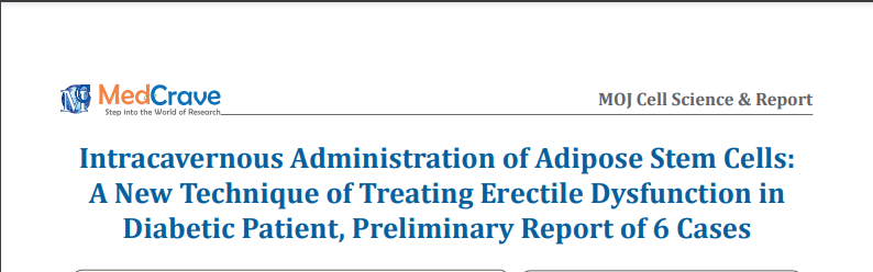 脂肪组织来源的干细胞(ASC)在分化能力、提供治疗效益 、容易和安全的细胞收获方面与骨髓干细胞相似。脂肪组织是 治疗勃起功能障碍的一种潜在的干细胞来源,这凸显了一种有效的临床治疗的可能性。干细胞具有多能分化和刺激血管生成/再生的特点。我们报道了海绵体内应用脂肪干细胞 (ASC)对糖尿病性勃起功能障碍患者的影响。
