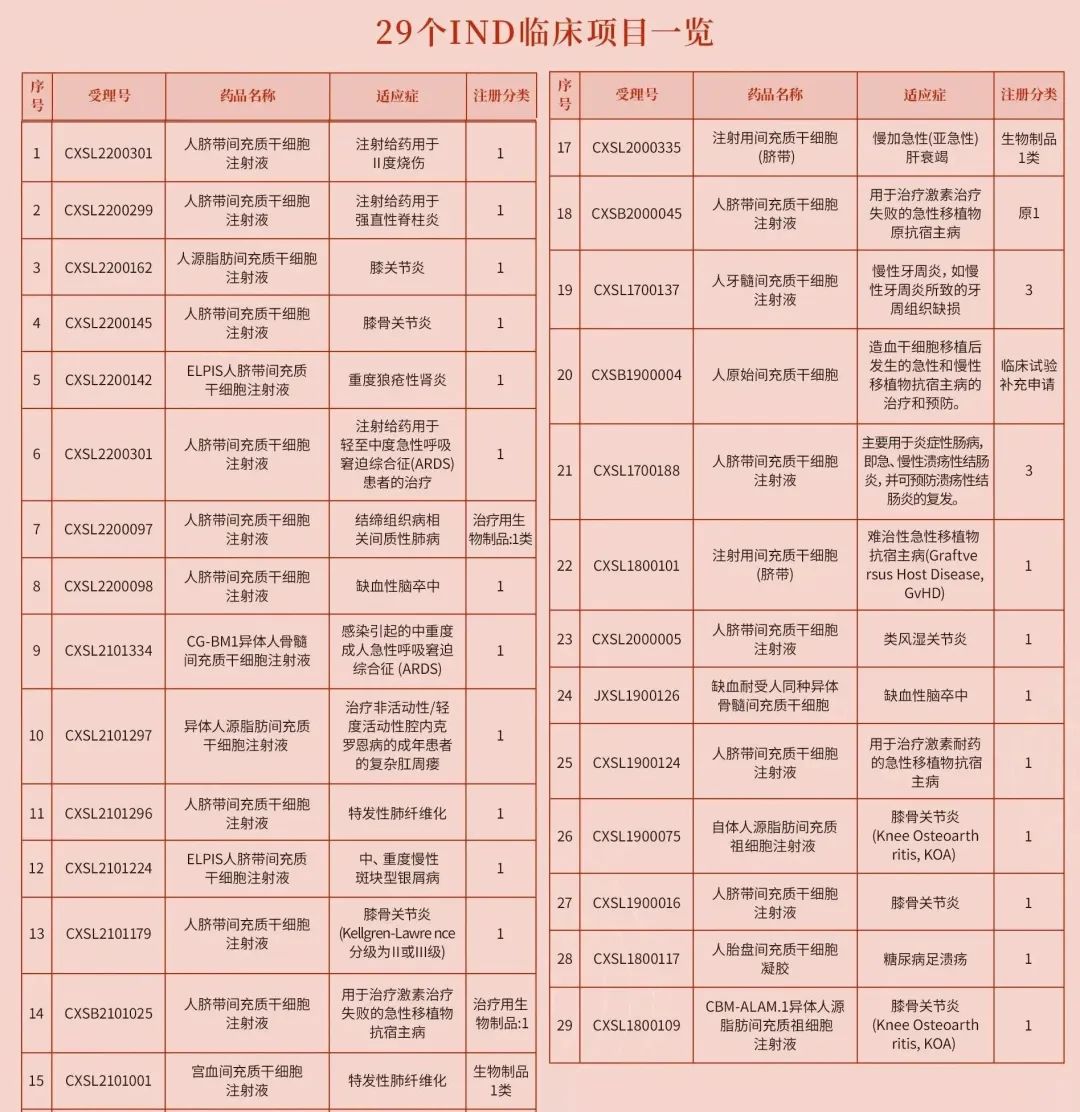 然而,在干细胞临床应用方面根据国家药品监督管理局药品审评中心公示信息显示,截止2022年10月31日,共有29个干细胞新药项目获得国家临床默示许可。分别是胎盘、脐带、牙髓、宫血、异体/自体脂肪来源的间充质干细胞,适应症包括膝骨关节炎、类风湿关节炎、糖尿病足溃疡、银屑病、肺纤维化、肝衰竭、卒中、急性呼吸窘迫综合征、牙周炎、克罗恩病和 GvHD