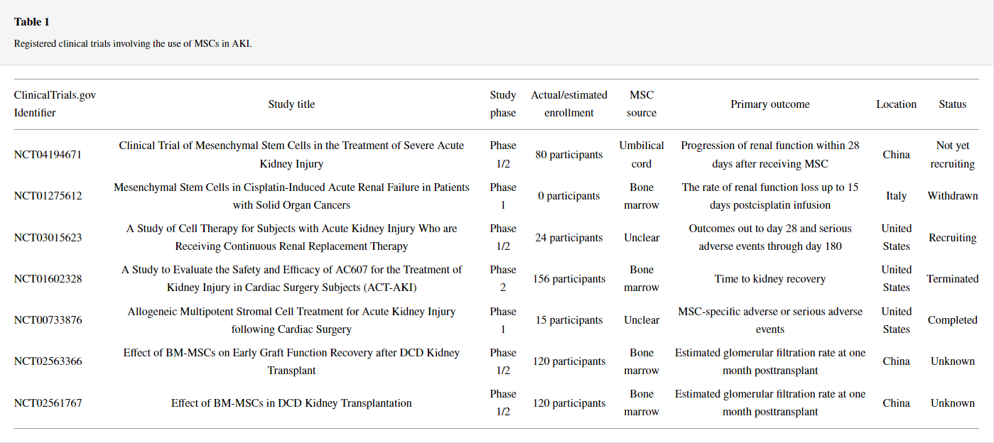 鉴于不同类型的临床前AKI模型的有希望的结果,已经进行了几项临床试验来评估基于MSC的干预措施对 AKI患者的安全性和有效性。
