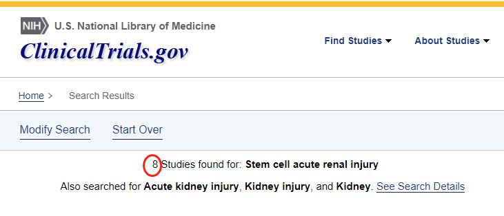 截止目前,已经有8项间充质干细胞治疗急性肾损伤的临床试验注册在美国国立卫生研究院的最大临床试验注册库http://clinicaltrials.gov上。