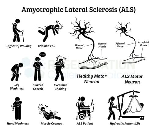 由于上、下运动神经元的快速变性,ALS等神经退行性疾病通常会导致肌肉萎缩、神经性疼痛、肌肉痉挛、频繁肌肉痉挛等。 全身抽筋或痉挛。这些症状经常被误认为是周围神经病变等其他疾病,随着时间的推移,ALS患者会失去控制自主运动、排便功能、呼吸衰竭以及负责眼球运动的眼外肌的使用能力。ALS不被认为是自身免疫性疾病的一个例子,尽管一些医学研究人员认为它可能是,部分原因是看似杂乱无章的免疫反应和氧化应激。