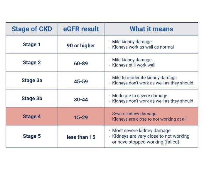 这是肾衰竭之前的最后阶段。定期拜访肾病专家(肾脏医生)非常重要,以采取措施减缓肾脏损伤,并提前计划可能的肾衰竭治疗方法。