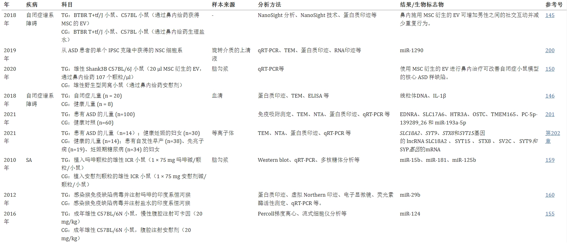 相关研究还表明,EVs在其他精神障碍(包括ASD、SA、SD和创伤后应激障碍)中也起着关键作用。表1总结了最新和有代表性的前期和临床研究。值得注意的是,这些精神疾病与前述疾病(包括精神分裂症、MDD和BD)之间的易感性有重叠,这很可能可以通过相同EVs或其载体的失调来治疗。