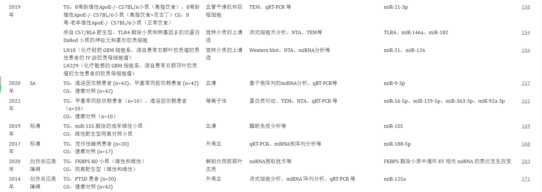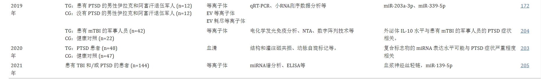 研究表明这些疾病可能具有相似的病理生理机制。尽管越来越多的新兴研究关注EV相关miRNA和PTSD的其他生物标志物,但大多数研究结果仍需要进一步的临床验证。