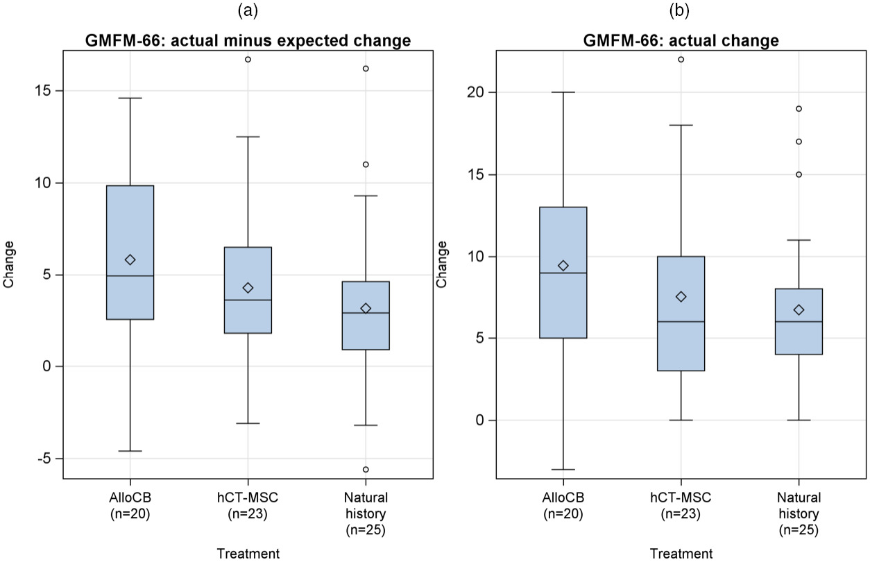 (a) 研究的主要结果是GMFM-66从基线到第12个月的实际减去预期变化。平均变化(和95%置信区间)为 5.8 (3.4–8.2)、4.3 (2.2–6.4 ),同种异体脐带血 (AlloCB)、人脐带组织来源的间充质基质细胞 (hCT-MSC) 和自然历史臂分别为 3.1 (1.4–5.0)。