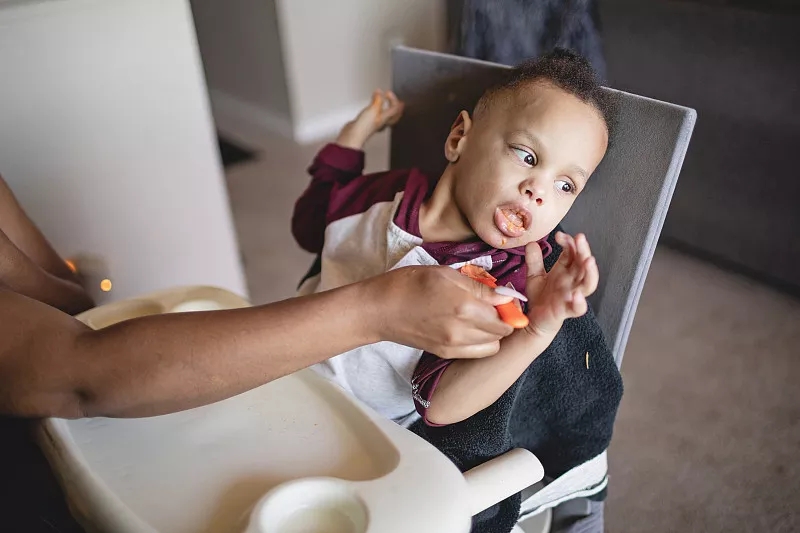 插图:脑瘫的非裔美国男孩在享受小吃时间