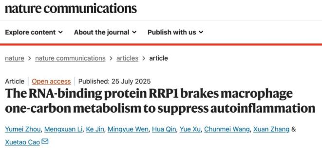 2025年7月25日,中国医学科学院系统医学研究院曹雪涛院士团队在《Nature Communications》上发表了题为:The RNA-binding protein RRP1 brakes macrophage one-carbon metabolism to suppress autoinflammation的研究论文。[10]