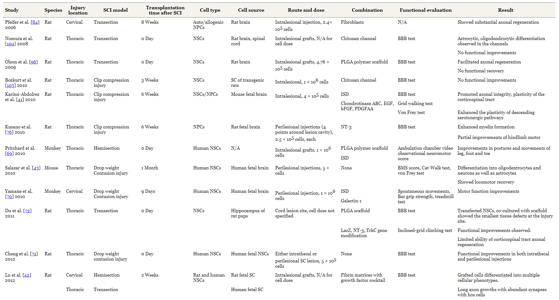 表1总结了使用NSC的实验研究的特点。NSC治疗已在SCI的各个阶段进行了测试:急性、亚急性和慢性。小鼠和大鼠是最常用的动物。