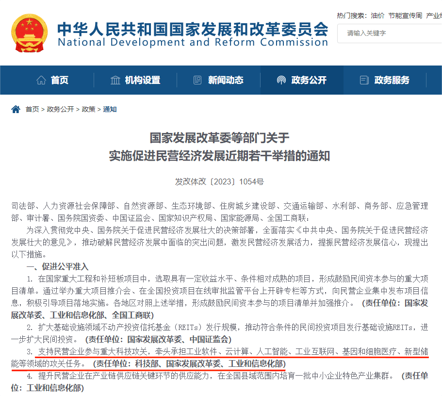 8月1日,国家发改委等部门联合发布关于实施促进民营经济发展近期若干举措的通知,聚焦促进公平准入、强化要素支持、加强法治保障、优化涉企服务、营造良好氛围等5个重要方面,提出28条具体措施。其中在“促进公平准入”方面指出要“支持民营企业参与重大科技攻关,牵头承担工业软件、云计算、人工智能、工业互联网、基因和细胞医疗、新型储能等领域的攻关任务”。(来源:国家发改委官网)