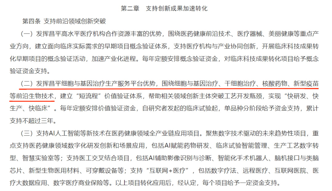 8月1日,北京市昌平区人民政府印发《中国(北京)自贸试验区科技创新片区昌平组团促进医药健康产业发展支持办法》,重点支持包括细胞与基因治疗(CGT)在内的四大方向,实现细胞与基因治疗、干细胞治疗等前沿生物技术及相关领域的创新突破。(来源:昌平区人民政府官网)