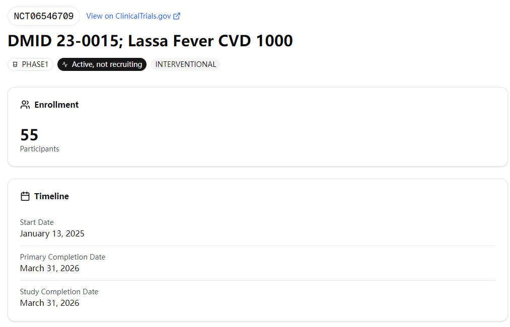 一项开创性的CVD 1000试验正在测试一种“一箭双雕”的疫苗。候选疫苗LASSARAB将拉沙病毒蛋白与狂犬病病毒载体结合,激发对两种疾病的同步免疫。[5]
