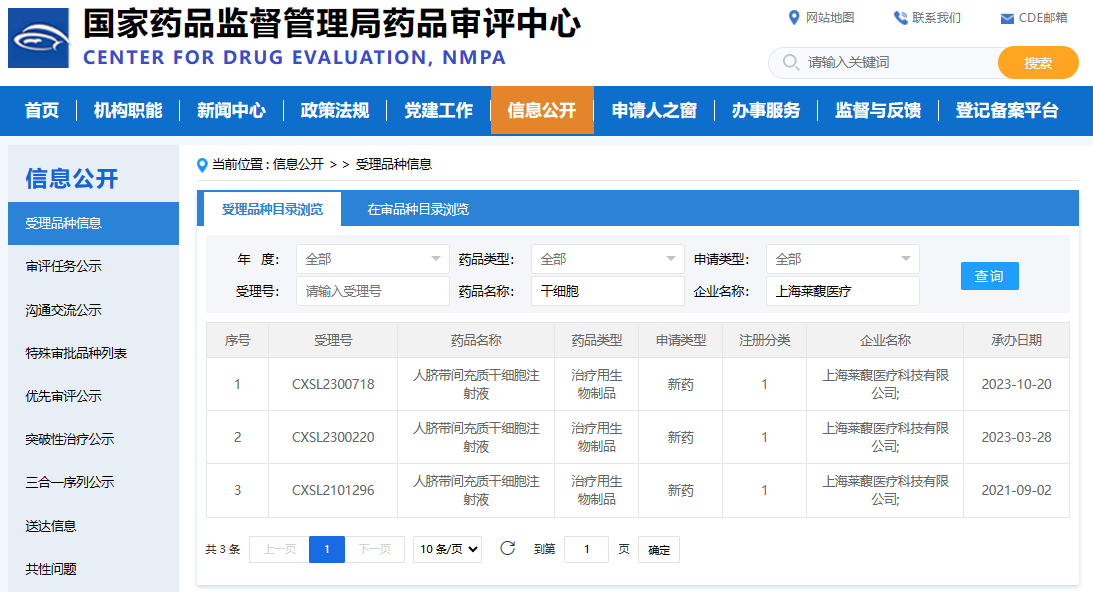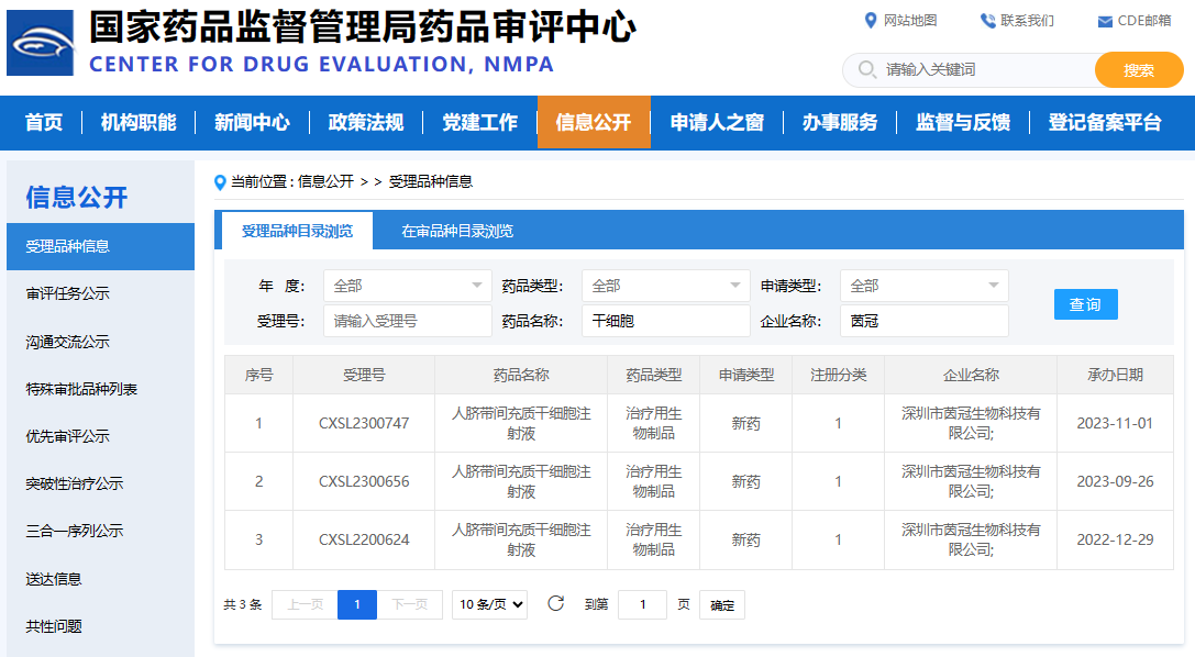 至于深圳,茵冠生物科技有限公司的表现更是令人瞩目。短短一个多月的时间里,该公司便有两款干细胞新药IND相继获得国家药品监督管理局的受理,其中人脐带间充质干细胞注射液于2023年11月1日成功获得受理(受理编号:CXSL2300747)。这不仅展现了茵冠生物在干细胞新药研发领域的强大实力,也充分体现了其快速反应和创新能力。