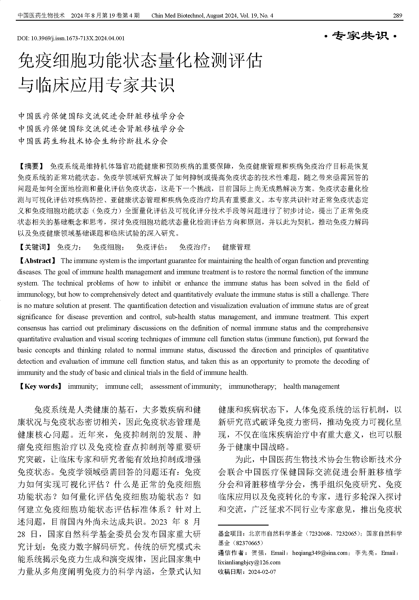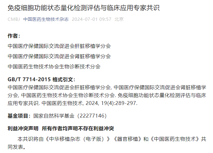 《中华移植杂志(电子版)》《器官移植》和《中国医药生物技术》共同发表《免疫细胞功能状态量化检测评估与临床应用专家共识》。