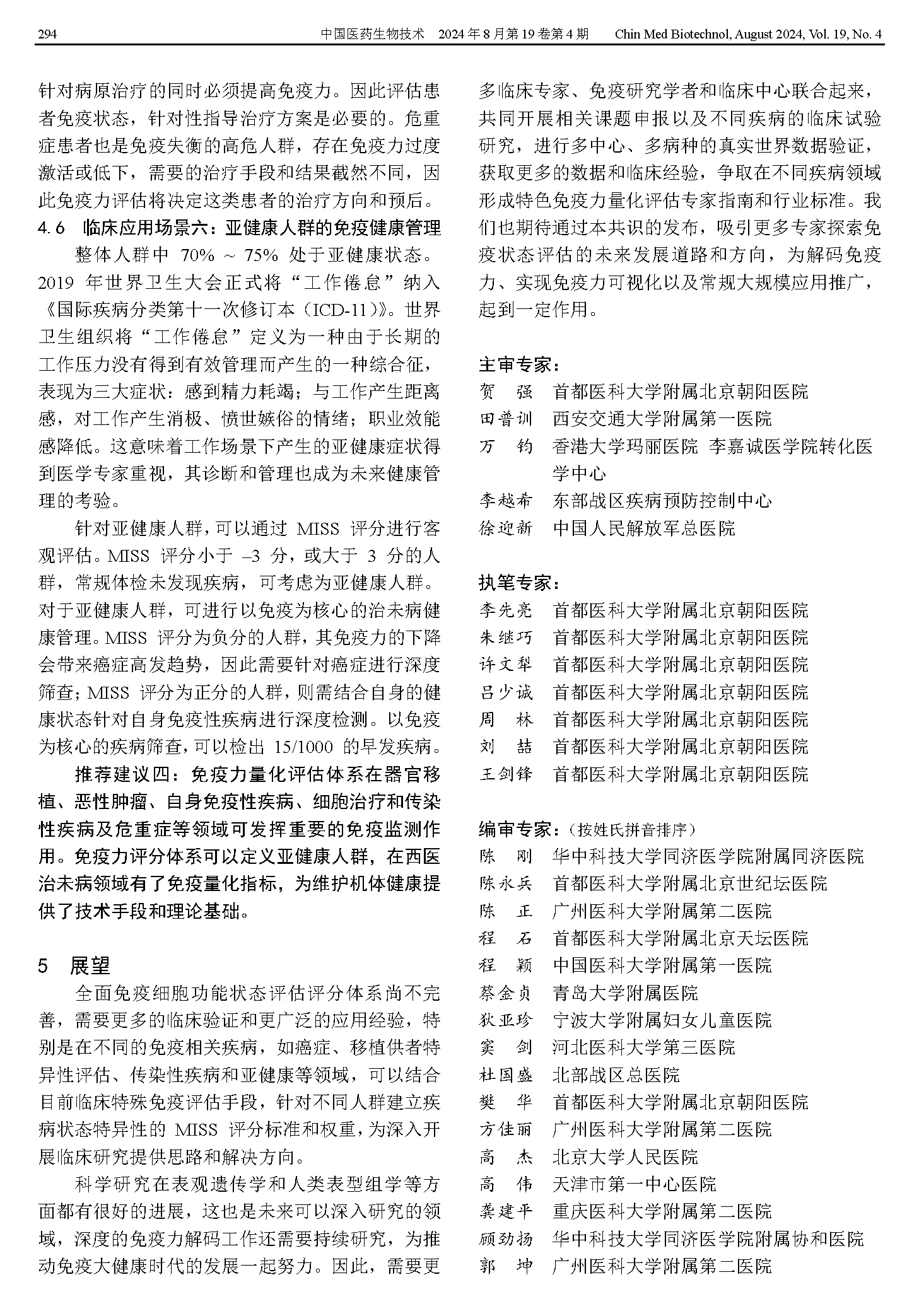 本专家共识针对正常免疫状态定义和免疫细胞功能状态(免疫力)全面量化评估及可视化评分技术手段等问题进行了初步讨论,提出了正常免疫状态相关的基础概念和思考,探讨免疫细胞功能状态量化检测评估方向和原则,并以此为契机,推动免疫力解码以及免疫健康领域基础课题和临床试验的深入研究。